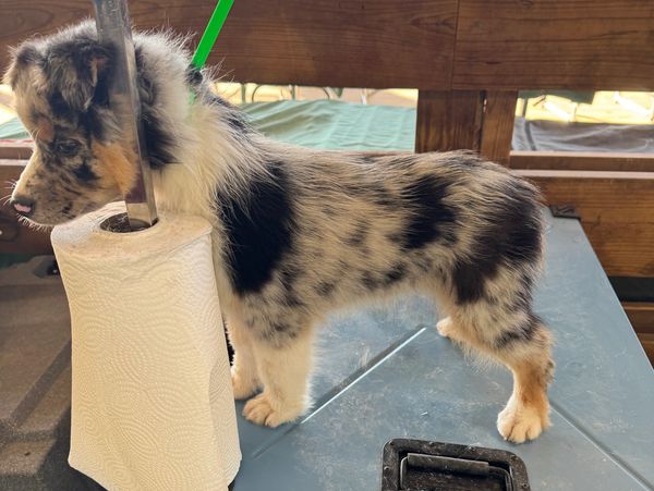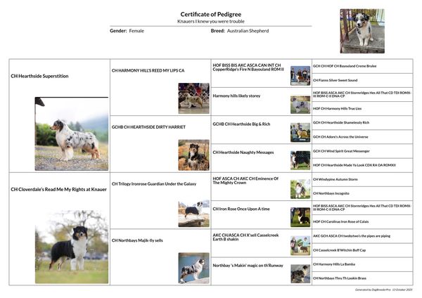 SIRE: AKC CH CKC GCH HEARTHSIDE SUPERSTITIOUS | DAM: AKC CH/ASCA MJR POINTED CLOVERDALES READ ME MY RIGHTS AT KNAUER VHMA TKN
